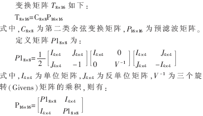 在有損壓縮中,通常先對圖像矩陣進行正交/雙正交變換,使能量分布集中,表示更為稀疏。離散余弦變換(DCT)由于具有良好的去相關(guān)效果,并且存在相應(yīng)的快速算法,應(yīng)用廣泛。雙正交重疊變換繼承了DCT 計算簡便、存儲要求低的特點,同時克服了DCT的塊效應(yīng)。這里以LBT為藍本提出雙正交重疊變換的快速整數(shù)實現(xiàn)算法,所有系數(shù)均采用分母為2的冪、分子為整數(shù)的分數(shù)近似,從而使整個變換過程只需要整數(shù)加法和位移運算。圖1給出了一維binLBT的實現(xiàn)流程,二維變換按先行后列的順序分別進行一維變換。