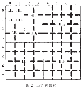 SPIHT作為一種高效零樹編碼方法,對位平面進行了集合劃分,將大量的非重要位0集中到幾個具有特定模式的集合里面,并對含有重要位的此類集合進行劃分,直至將集合劃分為具體的元素。LBT系數(shù)塊中存在著類似零樹結(jié)構(gòu)。圖2中給出了模仿小波變換中樹結(jié)構(gòu)的LBT塊變換中的零樹劃分方法,其中每一個線框?qū)?yīng)著一個系數(shù),實線則將64個系數(shù)分為10個子帶。由于塊變換具有集中能量的作用,系數(shù)的能量由左上到右下逐漸減少。