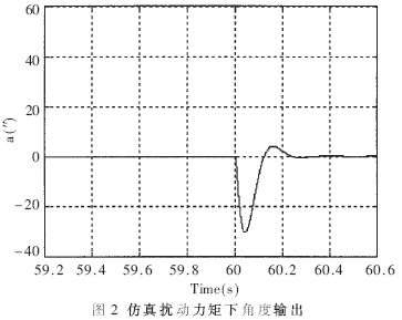 開機(jī)使平臺(tái)進(jìn)入穩(wěn)定狀態(tài),分別給方位、俯仰軸添加負(fù)載。3 000gcm擾動(dòng)力矩下,系統(tǒng)旋變角度輸出如圖7所示(在60秒時(shí)刻施加干擾力矩),滿足設(shè)計(jì)要求。