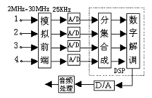 射頻信號變換到為中頻信號,再對信號進行放大、濾波、解調(diào)等處理,這使得系統(tǒng)抗干擾能力差?,F(xiàn)在也有一些數(shù)字短波接收機,在中頻對短波信號數(shù)字化,再利用DSP實現(xiàn)短波解調(diào)。由于依然使用到了太多的模擬器件,使得
