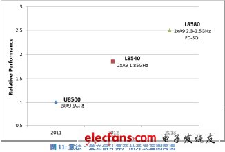 圖10 比較了我們的首款 FD-SOI 產(chǎn)品 NovaThor? L8580 與采用big.LITTLE 配置的四核處理器;前者內(nèi)置一顆基于兩個ARM Cortex-A9 處理器的 eQuad 處理器,后者的工作頻率在最近新推出的四核處理器中具有代表性。因為電壓/頻率范圍被擴展,不論是在高頻工作還是低功耗時,在相同的功耗下總能提供更高的性能,這歸功于Cortex-A9 處理器。與相比,Cortex-A9 是ARM 的上一代處理器架構(gòu)。除更高的性能和更低的功耗外,還有一個重要優(yōu)勢:采用簡單的傳統(tǒng)的雙核處理器結(jié)構(gòu),且處理器管理軟件的技術(shù)也非常成熟,而big.LITTLE 產(chǎn)品則需要前文討論的異構(gòu)多核處理器所需的復(fù)雜的軟硬件管理方法。