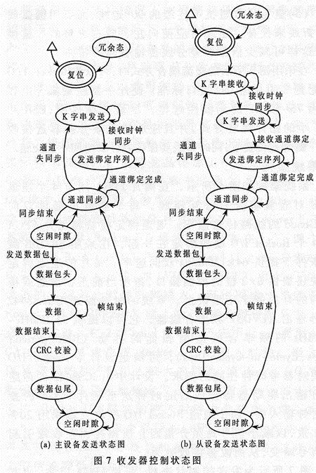 圖7所示為發(fā)送控制狀態(tài)機(jī),兩片F(xiàn)PGA以主、從方式工作,主設(shè)備在復(fù)位后連續(xù)發(fā)送用于修正接收鎖相環(huán)時(shí)鐘的特定“K”字符,同時(shí)從設(shè)備判斷是否成功接收到“K”字符。如從設(shè)備成功接收則表明接收時(shí)鐘正確恢復(fù),然后從設(shè)備發(fā)送“K”字符以使主設(shè)備的接收時(shí)鐘同步。主設(shè)備判斷每個(gè)通道是否都進(jìn)入接收時(shí)鐘同步狀態(tài),若是則開(kāi)始發(fā)送通道綁定序列。從設(shè)備確定接收通道綁定完成后,停止向主設(shè)備發(fā)送“K”字符而改發(fā)通道綁定序列,使主設(shè)備也完成接收綁定。此時(shí)主、從設(shè)備都維持在通道綁定狀態(tài),并且間歇發(fā)送鎖相環(huán)同步“K”字符以維持接收時(shí)鐘同步。若此時(shí)有一側(cè)進(jìn)入失同步狀態(tài),以上同步、綁定過(guò)程將由主設(shè)備再次發(fā)起。在設(shè)計(jì)中幀的數(shù)據(jù)段長(zhǎng)度固定為1K(8Byte),數(shù)據(jù)段結(jié)束后為4字節(jié)的CRC校驗(yàn)值,如接收CRC錯(cuò)誤則將該幀丟棄。任何一方要發(fā)送數(shù)據(jù)幀時(shí)便在幀的首尾各插入一個(gè)空閑時(shí)隙,并在發(fā)送完成后繼續(xù)維持同步狀態(tài)。