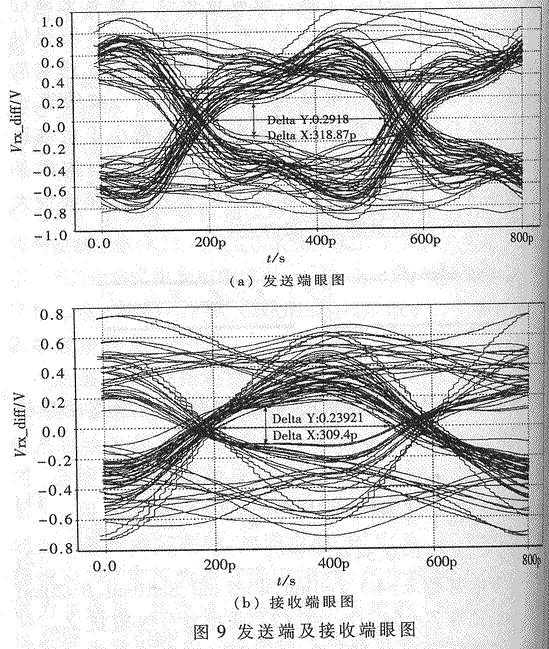 分別對(duì)發(fā)送端差分輸出和接收端差分輸入信號(hào)進(jìn)行眼圖分析,得到如圖9所示的眼圖。圖中測(cè)得發(fā)端抖動(dòng)為0.203UI,接收端抖動(dòng)為0.227UI,但這只是仿真得到的電路固有抖動(dòng),在實(shí)際情況下的隨機(jī)抖動(dòng)對(duì)性能的影響并未在仿真中考慮。由圖中可以看出,在發(fā)端采用20%預(yù)加重后接收端眼圖的寬度和張開(kāi)程度都有所改善,因而可以較好地恢復(fù)發(fā)送信號(hào)。