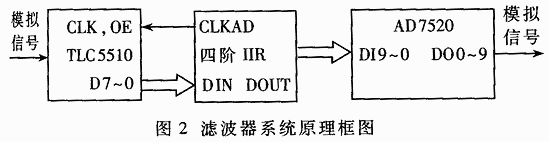 系統(tǒng)原理框圖如圖2所示,模擬信號經(jīng)過TLC5510轉(zhuǎn)換為00H~FFH的二進制數(shù)后,送入四階IIR低通濾波器,處理后輸出10位二進制數(shù)送AD7520得到雙極性的模擬電壓輸出。