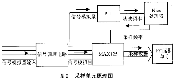 從FFT的分析可知,其誤差很大程度來自采樣窗口和實際波形的同步不嚴(yán)格,造成頻譜泄漏。為消除頻譜泄漏引起的誤差,常用的方法有:硬件同步、加窗處理。硬件同步的方法比較多,常用的主要有使用PLL電路進(jìn)行同步。按照GB/T14549-1993要求,只允許使用矩形窗和漢寧窗,使用矩形窗時窗口間不能有間隔和重疊。為減少信號的混疊和頻譜泄漏,本系統(tǒng)的A/D采樣單元通過使用高精度的PLL實現(xiàn)嚴(yán)格的同步采樣,以保證窗口間無重疊和間隔,并能嚴(yán)格與被測信號頻同步,并在FFT運算單元實現(xiàn)了加漢寧窗處理。采樣單元基本原理如圖2所示。