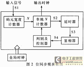 ??? 圖2是該位同步模塊的結(jié)構(gòu)框圖。為了使接收端能快速、準(zhǔn)確地提取碼元時(shí)鐘,發(fā)送端在發(fā)送m序列前應(yīng)先發(fā)送一定數(shù)量的0101序列(見(jiàn)圖3中的S1),其中“0”和“1”的寬度與單個(gè)碼元寬度相同。在接收端預(yù)先不知道信號(hào)單個(gè)碼元寬度(即碼元時(shí)鐘)的情況下,位同步模塊首先進(jìn)行碼元寬度檢測(cè)。這一工作主要由碼元寬度計(jì)數(shù)器完成。該計(jì)數(shù)器在高速全局時(shí)鐘驅(qū)動(dòng)下分別對(duì)信號(hào)中的“0”、“1”電平進(jìn)行寬度計(jì)數(shù)。
