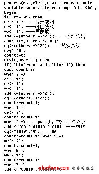 ?????? 采用FPGA來(lái)實(shí)現(xiàn)Flash編程器,主要是如何對(duì)Flash進(jìn)行寫(xiě)操作,利用VHDL語(yǔ)言編寫(xiě)的寫(xiě)操作進(jìn)程表示如下: