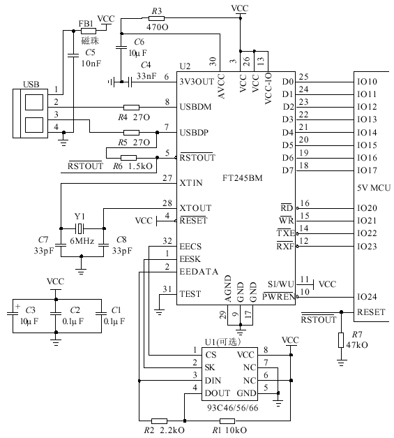 FT245BM的典型硬件電路如圖3所示。該電路采用總線(xiàn)供電模式,同時(shí)采用上電復(fù)位方式,通過(guò)的輸出使單片機(jī)復(fù)位。時(shí)鐘電路可采用4腳的6 MHz晶振模塊或由1個(gè)6 MHz的晶體及2個(gè)33 pF的電容組成。腳和I/O 24腳相連,用于判斷USB總線(xiàn)是處于掛起狀態(tài)還是正常狀態(tài)。在USB接口的電源端采用一個(gè)磁珠,以減少主機(jī)和設(shè)備的干擾;同時(shí),電源端增加了去耦和旁路電容,以提高電路的抗干擾性能。在PCB板的設(shè)計(jì)中,數(shù)據(jù)線(xiàn)的走線(xiàn)應(yīng)盡可能短并且長(zhǎng)度相等。圖3中的93C46(93C56或93C66)是一片EEPROM,用于存儲(chǔ)產(chǎn)品的VID、PID、設(shè)備序列號(hào)及一些說(shuō)明性文字等。這些需要用戶(hù)自己編寫(xiě),編寫(xiě)的應(yīng)用程序由FTDI提供。用戶(hù)只須運(yùn)行相應(yīng)的VB應(yīng)用程序,寫(xiě)入自己相應(yīng)的信息即可。該EEPROM是可選的。若沒(méi)有EEPROM,FT245BM將使用默認(rèn)的VID、PID、產(chǎn)品描述符和電源描述符,并且沒(méi)有設(shè)備的序列號(hào)。
