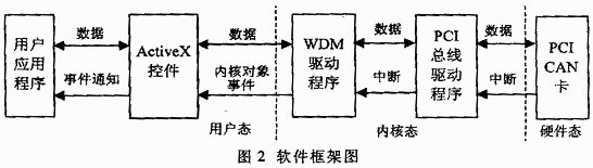 ??? 為了方便用戶的使用,還應(yīng)編寫相應(yīng)的API函數(shù)或ActiveX控件等其它應(yīng)用層的程序提供給用戶。由于ActiveX控件基于先進的COM技術(shù),具有良好的封裝性、使用靈活性等特點,可使用戶編程簡單、方便,因此在CAN卡的設(shè)計中編寫了ActiveX控件。ActiveX控件負責(zé)與驅(qū)動程序的通信,通過控件的事件把CAN卡接收的數(shù)據(jù)通知給用戶程序,利用控件的屬性設(shè)置CAN通信控制器,按照設(shè)置的方法發(fā)送用戶程序的數(shù)據(jù)。?