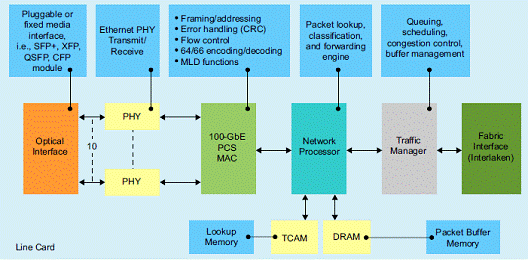 ■ MAC/PCS—The MAC/PCS unit performs the gearbox, scrambling, and encoding functions based on the protocol. In the case of 40-GbE or 100-GbE implementations, there is a multilane distribution (MLD) function as per the IEEE 802.3ba specifications. In addition, flow control as well as error handling is performed by the MAC.In some cases, the received 10G data from the MAC unit is aggregated before it is passed over to the network processing unit (NPU).