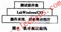 “無線電高度表測試系統(tǒng)”軟件主要由操作系統(tǒng)(Windows XP)、設備驅動程序、開發(fā)平臺LabWindows/CVI和測試軟件集組成,相互關系見圖4。