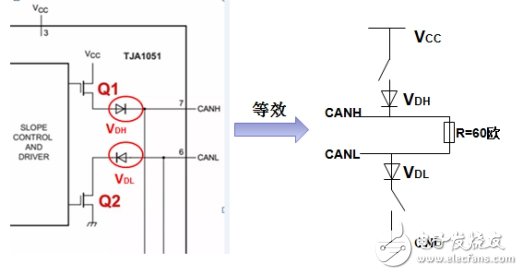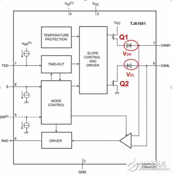 CAN_Rx和CAN_Tx分別是從MCU中接出來的引腳,比如MCU要發(fā)送一個(gè)邏輯1,則只要將CAN_Tx設(shè)置為1,經(jīng)過CAN