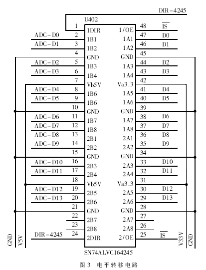 LF2407A的工作電壓為3.3V,A/D轉(zhuǎn)換器MAXl25的工作電壓為5V.不能直接接口,需要引入電平轉(zhuǎn)換電路,這里選取16位的SN74ALVCl64245做電平轉(zhuǎn)換器。轉(zhuǎn)換器左側(cè)B端是5V的邏輯電平.與MAXl25 A/D轉(zhuǎn)換器接口;右側(cè)A端是3.3V的邏輯電平,與LF2407A接口。具體電路見(jiàn)圖3。