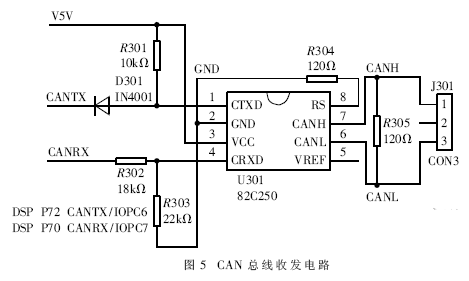 ?LP2407A集成了CAN控制器,擴(kuò)展一片CAN收發(fā)器就構(gòu)成了CAN接口電路。收發(fā)器選用Philips公司的P82C250,具體電路如圖5。