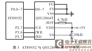 ????? LCD與單片機(jī)的接口方法分為直接訪問方式和間接控制方式。直接訪問方式是把液晶模塊作為存儲(chǔ)器接在CPU的數(shù)據(jù)線、地址線和控制線上,同時(shí)把它的數(shù)據(jù)總線接在89S52的P0口上,片選以及寄存器選擇信號(hào)線由P2口提供,讀寫操作由單片機(jī)的讀寫操作信號(hào)控制。這種方式是以訪問存儲(chǔ)器的方式來訪問液晶顯示模塊。間接控制方式不使用單片機(jī)的數(shù)據(jù)系統(tǒng),而是利用它的I/O口來實(shí)現(xiàn)與顯示模塊的通信,即將液晶顯示模塊的數(shù)據(jù)線與單片機(jī)的P0口連接作為數(shù)據(jù)總線,另外3根時(shí)序控制信號(hào)線通常利用89S52的P3口中未被使用的I/O口來控制。這種訪問方式不占用CPU的存儲(chǔ)器空間,它的接口電路與時(shí)序無關(guān),其時(shí)序完全靠軟件編程實(shí)現(xiàn)。間接控制方式的速度較直接訪問方式快,所以本設(shè)計(jì)中采用的是間接控制方式,具體連接如圖3所示。