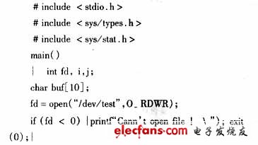 這樣在重新編譯的內(nèi)核中,就包含了名為“test”的設(shè)備驅(qū)動,下面的例子是用于驗(yàn)證這個設(shè)備驅(qū)動程序的,至于怎樣運(yùn)行這個驗(yàn)證程序?qū)⒃谙旅妗皯?yīng)用程序的編寫”一節(jié)中講解: