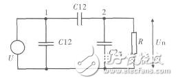 C12是導(dǎo)體1與導(dǎo)體2之間的分布電容,C1g是導(dǎo)體1與地之間的電容,C2g是導(dǎo)體2與地之間的電容,R是導(dǎo)體2與地之間的電阻,U1是作為騷擾源的導(dǎo)體1的電壓,電路2為受干擾電路,Un是線路2與地之間產(chǎn)生的騷擾電壓。