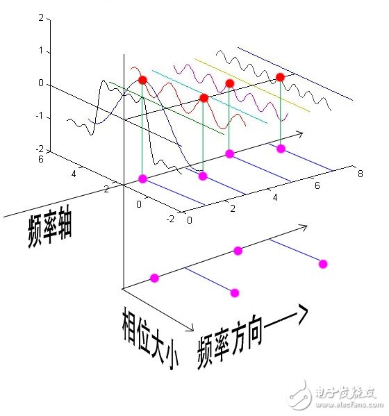 鑒于正弦波是周期的,我們需要設定一個用來標記正弦波位置的東西。在圖中就是那些小紅點。小紅點是距離頻率軸最近的波峰,而這個波峰所處的位置離頻率軸有多遠呢?為了看的更清楚,我們將紅色的點投影到下平面,投影點我們用粉色點來表示。當然,這些粉色的點只標注了波峰距離頻率軸的距離,并不是相位。