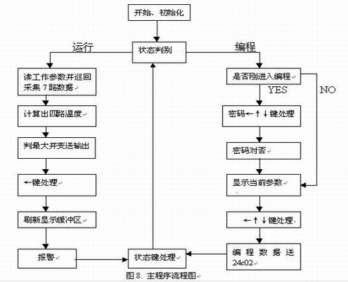 單片機首先進行初始化,程序的初始狀態(tài)設(shè)置為運行狀態(tài),除剛通電進入運行狀態(tài)外,以后程序須判斷狀態(tài)標志位,根據(jù)判斷結(jié)果程序進入編程或運行狀態(tài)。在運行狀態(tài)下無法對各參數(shù)進行編輯,只能從24C02讀出各種運行工作參數(shù),巡回測量輸入信號,最后通過零點滿度自校正處理,冷端補償計算,查表處理得出各測量點溫度值。在該狀態(tài)下可通過←鍵選擇顯示測量、報警、故障信息等各種運行參數(shù)。在編輯參數(shù)的狀態(tài)下系統(tǒng)不進行測量,剛進入編程狀態(tài)時要求輸入編程充許密碼,在輸入密碼正確的前提下,可以通過←鍵選擇各設(shè)定各參數(shù),并可通過↑↓按鍵修改,存入24C02中,停止按鍵操作5分鐘后不管是否按狀態(tài)鍵均自動轉(zhuǎn)入運行狀態(tài)。