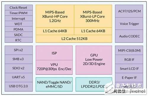 M200采用大小核設(shè)計(jì)微結(jié)構(gòu)為XBurst,采用40nm制程,32位XBurst雙核設(shè)計(jì),大核1.2GHz,小核300MHz,功耗為 0.07mW/MHz,內(nèi)置語(yǔ)音喚醒引擎,支持3D圖形加速,720p攝像壓縮以及語(yǔ)音喚醒功能,支持MIPI圖像顯示和采集接口,同時(shí)具備ISP圖像處理功能,存儲(chǔ)器接口支持LPDDR2。