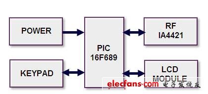 該遙控采用PIC微控器、IA4421無線傳輸芯片,基于IA4421的無線模塊工作頻率為433MHz、通訊速率為9.6KB、數(shù)據(jù)傳輸空曠距離不小于110米、至少能夠穿透2堵墻,可以滿足大部分用戶要求。該無線搖控器具有功能如下:設(shè)定水溫溫度、顯示水溫溫度、設(shè)定即時加熱模式、設(shè)定主機電源開關(guān)、設(shè)定智能控制、功率檔位設(shè)定、時間顯示、具備運行模式和睡眠模式、無線學(xué)習(xí),當(dāng)學(xué)習(xí)鍵按下時,進入學(xué)習(xí)狀態(tài),學(xué)習(xí)指示燈LED亮,當(dāng)學(xué)習(xí)成功后,立即返回,LED燈滅,平時為透明數(shù)據(jù)傳送狀態(tài)。遙控系統(tǒng)硬件結(jié)構(gòu)如圖6所示。