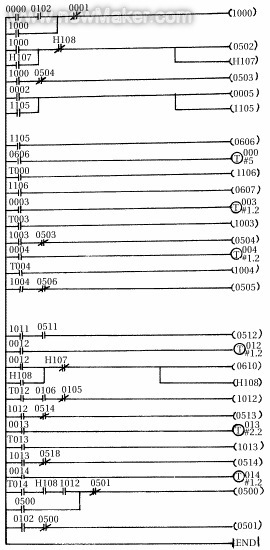 設(shè)計(jì)控制指令時(shí)安排了13個(gè)計(jì)時(shí)器。另外啟用19個(gè)中間繼電器,地址代號(hào)1000系列。計(jì)時(shí)器和中間繼電器地址號(hào)只是作為控制指令中的特殊代碼(助記符),編進(jìn)梯形圖或簡(jiǎn)易程序,輸入編程器由PLC機(jī)去執(zhí)行運(yùn)算。繪制PLC控制梯形圖。如圖2示。(限于篇幅,梯形圖作了刪節(jié))。