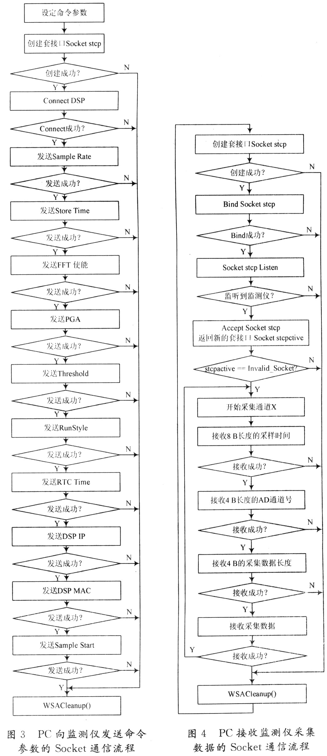 ??? 當(dāng)上位PC機(jī)向監(jiān)測(cè)儀發(fā)送IP地址、MAC地址等命令參數(shù)時(shí),監(jiān)測(cè)儀作為服務(wù)器端,PC機(jī)作為客戶端。在服務(wù)器端和客戶端分別創(chuàng)建一個(gè)套接口Socket,然后在系統(tǒng)上電后,監(jiān)測(cè)儀就處于監(jiān)聽(tīng)狀態(tài),當(dāng)監(jiān)聽(tīng)到PC有連接請(qǐng)求時(shí),監(jiān)測(cè)儀服務(wù)端又創(chuàng)建一個(gè)新的套接口stcpctive來(lái)與PC建立連接,當(dāng)監(jiān)測(cè)儀與PC建立連接以后,PC就可以向監(jiān)測(cè)儀發(fā)送命令參數(shù)了。在此過(guò)程中,PC每次向監(jiān)測(cè)儀發(fā)送100 B的命令參數(shù),其中,第一個(gè)字節(jié)是區(qū)分不同命令參數(shù)的標(biāo)志,監(jiān)測(cè)儀接收到命令參數(shù)后,利用這個(gè)標(biāo)志來(lái)設(shè)置的各項(xiàng)參數(shù),通過(guò)這種方式,依次設(shè)定監(jiān)測(cè)儀各個(gè)通道的采樣頻率、保存時(shí)間、PGA、采樣閾值、FFT使能以及監(jiān)測(cè)儀本身的IP地址、MAC地址、運(yùn)行時(shí)模式以及監(jiān)測(cè)儀系統(tǒng)時(shí)間的設(shè)置,其流程如圖3所示。