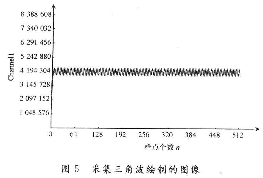 ??? 橋梁健康監(jiān)測(cè)技術(shù)的發(fā)展還有很多處于實(shí)驗(yàn)室研究階段,因此,數(shù)據(jù)的采集測(cè)試是在實(shí)驗(yàn)室環(huán)境下采用波形發(fā)生器產(chǎn)生的三角波信號(hào)來(lái)模擬實(shí)際現(xiàn)場(chǎng)傳感器信號(hào)。設(shè)定好通道號(hào)、采樣時(shí)間、采樣頻率和放大倍數(shù)等命令參數(shù),運(yùn)行程序,可以看到如圖5所示的三角波波形。其中,橫坐標(biāo)表示在設(shè)定的采樣時(shí)間內(nèi)采集數(shù)據(jù)的個(gè)數(shù),即為1 s時(shí)間內(nèi)采集512個(gè)數(shù)據(jù)。縱坐標(biāo)表示采集信號(hào)的幅值,由于從傳感器出來(lái)的信號(hào)電壓是-2.5~2.5 V,ADC采樣分辨率為24 b,去掉第24位,取中間值即222,為0 V,如圖5所示。采集數(shù)據(jù)無(wú)漏點(diǎn),波形完整,因此符合橋梁健康監(jiān)測(cè)系統(tǒng)的采集數(shù)據(jù)的基本需要。