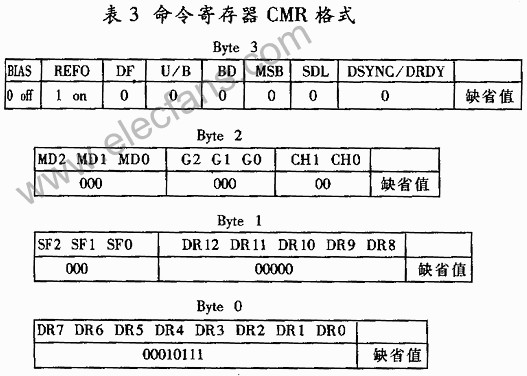 命令寄存器CMR是一個(gè)32位寄存器,通過對(duì)它的操作可以設(shè)置ADS1211/10的各種工作模式,格式如表3所示。