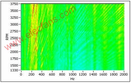 圖 7 旋轉(zhuǎn)機(jī)械升速過程轉(zhuǎn)速-頻率譜圖