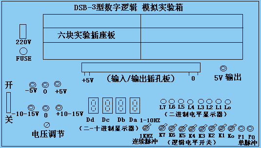 ??? 附圖1-1為實(shí)驗(yàn)箱結(jié)構(gòu)示意圖,整個(gè)面板分成三部分,即多孔實(shí)驗(yàn)插座板部分;操作板部分;多路電源部分。由于這三部分組合在一塊面板上,使實(shí)驗(yàn)時(shí)電源線、各種脈沖信號(hào)線與插座板上實(shí)驗(yàn)線路的連接方便可靠。