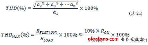 信號電平變化會引起RON變化,造成開關(guān)的插入損耗變化,這會增大 模擬開關(guān)的總諧波失真(THD)。以RON平坦度為10Ω的100Ω開關(guān)為例,當負載為600Ω時,開關(guān)將產(chǎn)生1.67%的THDMAX。THD是許多應(yīng) 用中的關(guān)鍵參數(shù),表示通過開關(guān)的信號質(zhì)量或保真度。THD的定義為全部諧波分量的平方和的平方根與基波分量之比(式2a)。用式2b計算最大THD。圖5 所示為不同開關(guān)的THD比較。
