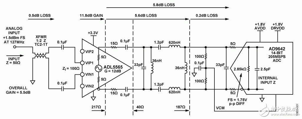 10 圖1中的電路是基于 ADL5565 超低噪聲差分放大器驅(qū)動(dòng)器和 AD9642 14位、250 MSPS模數(shù)轉(zhuǎn)換器(ADC)的窄帶通接收機(jī)前端。三階巴特沃茲抗混疊濾波器基于放大器和ADC的性能和接口