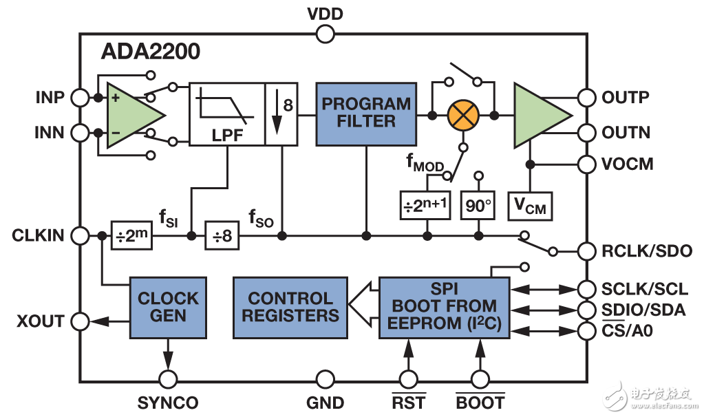 ADA2200集成式同步解調(diào)器采用獨(dú)特的電荷共享技術(shù)來執(zhí)行模擬域內(nèi)的分立式時(shí)間信號(hào)處理。該器件的信號(hào)路徑由輸入緩沖器、FIR抽取濾波器(進(jìn)行抗混疊濾波)、可編程 IIR濾波器、相敏檢波器以及差分輸出緩沖器組成。其時(shí)鐘生成功能可將激勵(lì)信號(hào)與系統(tǒng)時(shí)鐘同步。通過SPI兼容接口可配置可編程特性。