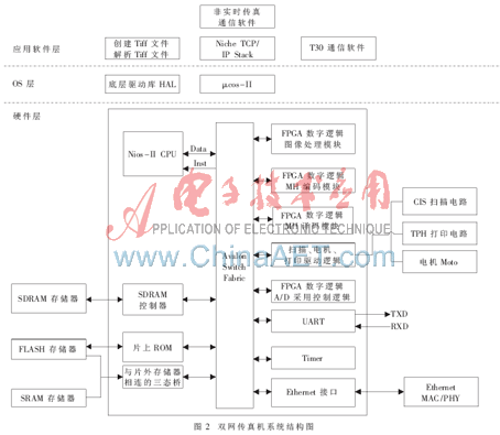 ?? ?本文設(shè)計(jì)的雙網(wǎng)傳真機(jī)以Nios II嵌入式軟核為處理器,采用SoPC[2]的軟硬件協(xié)同設(shè)計(jì)方法進(jìn)行設(shè)計(jì),以求最佳的性能價(jià)格比。SoPC技術(shù)硬件用Altera公司的FPGA技術(shù)來(lái)實(shí)現(xiàn),軟件用C語(yǔ)言編程實(shí)現(xiàn),操作系統(tǒng)平臺(tái)采用實(shí)時(shí)操作系統(tǒng)內(nèi)核μC/OS-II、TCP/IP協(xié)議棧使用Niche TCP/IP協(xié)議棧。以Altera Cyclone EP1C20為實(shí)驗(yàn)板進(jìn)行系統(tǒng)實(shí)現(xiàn)和驗(yàn)證。