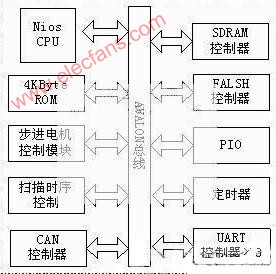通過(guò)Altera的SOPC Builder軟件包能制定基于Nios軟核的FPGA系統(tǒng),他提供了一些基本的Nios外設(shè)模塊,如UART控制器、定時(shí)器、FLASH控制器、SDRAM控制器等。本文設(shè)計(jì)的CT掃描系統(tǒng)控制器FPGA內(nèi)部結(jié)構(gòu)如圖2所示。