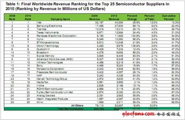 %。 ? Gartner宣布,2023年排名前25位的半導體廠商的半導體營收合計下降14.1%,占市場份額為74.4%,低于2022年的77.2%。由于2023年內(nèi)存市場表現(xiàn)不佳,全球前十名半導體廠商的排名發(fā)生變化