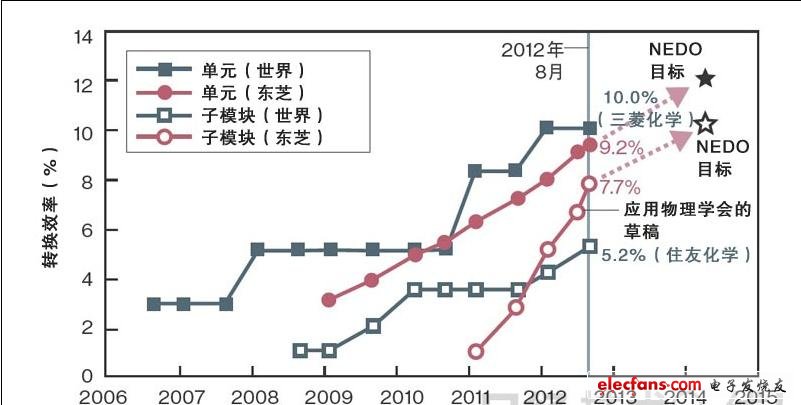 圖2:不到兩年的時(shí)間東芝制作的OPV模塊的能量轉(zhuǎn)換模塊效率就躍居世界頂級(jí)水平