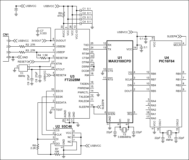 The application circuit shown in Figure 1 consists of the MAX3100 UART, a FT232BM UART-to-USB converter, a 93C46 serial EEPROM, and a PIC16F84 microcontroller. Since the PIC16F84 does not have any internal USB or UART peripherals, the MAX3100 makes the perfect external UART peripheral. The program, shown in Listing 1, interfaces the PIC16F84 to the MAX3100 via SPI.