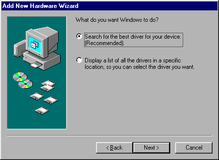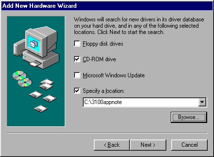 Step 3: When the third screen shows up, guide Windows to the location you uncompressed the file R9012134.ZIP by pressing the Browse button. For example C:\3100appnote. Press the Next > button to start the search.