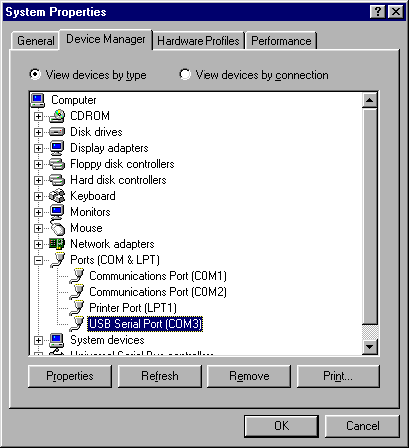 Step 6: Verify that a USB virtual COM port was installed correctly by viewing the ports section of the Device Manager tab located in System Properties | Device Manager | Ports.