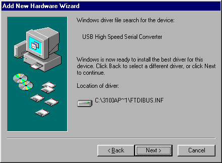 Step 4: When the next screen shows up press the Next > button after the FTDIBUS.INF driver file has been located.