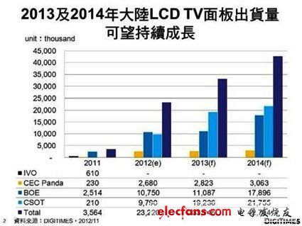 DIGITIMES Research 預(yù)估,2012年中國面板廠商在LCD TV面板出貨量預(yù)估可達(dá)2,322萬片,較2011年成長552%。2013年預(yù)估中國面板廠商于LCD TV面板出貨量仍可成長43%,主要原因在于華星光電產(chǎn)能進(jìn)行第二階段的擴(kuò)增,估計(jì)2013年第四季該公司8.5代線可達(dá)13萬片玻璃基板的月投片產(chǎn)能。
