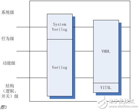 HDL語(yǔ)言除了前面提到的兩種外,歷史上也出現(xiàn)了其他的HDL語(yǔ)言,有ABEL、AHDL、硬件C語(yǔ)言(System C語(yǔ)言、Handle-C)、System verilog等。其中ABEL和AHDL算是早期的語(yǔ)言,因?yàn)橄啾惹懊鎯煞N語(yǔ)言來(lái)講,或多或少都有些致命的缺陷而在小范圍內(nèi)使用或者直接淘汰掉了。而因?yàn)閂HDL和Verilog在仿真方面具有仿真時(shí)間長(zhǎng)的缺陷,System verilog和硬件C語(yǔ)言產(chǎn)生了,從圖3看,System Verilog是在系統(tǒng)級(jí)和行為級(jí)上為Verilog做補(bǔ)充,同時(shí)硬件C語(yǔ)言產(chǎn)生的原因還有就是有種想把軟件和硬件設(shè)計(jì)整合到一個(gè)平臺(tái)下的思想。