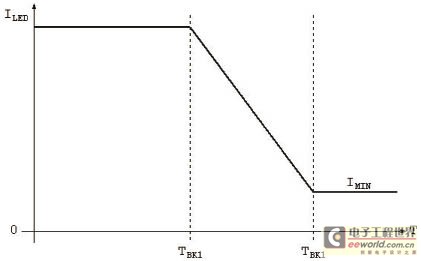 如圖2使用LM3424所示,集成電路將在到達(dá)某溫度時(shí)返送LED電流,此時(shí),LED電流為零。這與LED作為系統(tǒng)中主要熱發(fā)生器的情況不同。對(duì)于大燈組件等應(yīng)用,設(shè)計(jì)師可能想要設(shè)置一項(xiàng)安全功能,即使LED可能在超出安全工作區(qū)的條件下工作,也始終能夠提供光輸出。對(duì)于此類(lèi)情況,LED電流與溫度曲線將如圖4中示例所示。雖然LM3424沒(méi)有這項(xiàng)內(nèi)置功能,但這可以使用外部箝位電路輕松實(shí)現(xiàn),并且防止TSENSE針腳上的電壓低于預(yù)規(guī)定值。