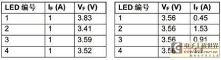 下例顯示了VF變化的影響。在實(shí)驗(yàn)中,使用圖9所示兩種設(shè)置收集數(shù)據(jù)。一種設(shè)置用于4個(gè)LED(每個(gè)LED都具有專(zhuān)門(mén)的電流源),另一種設(shè)置用于并聯(lián)的4個(gè)LED(共享一個(gè)電流源)。表1所示數(shù)據(jù)在25℃加電后5秒內(nèi)測(cè)得,以最大限度降低LED自發(fā)熱的影響。