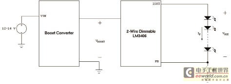 根據(jù)具體的設(shè)計(jì),上述問(wèn)題的影響可能可以忽略。但是,如果系統(tǒng)設(shè)計(jì)師對(duì)上述影響存有顧慮,可以采用單個(gè)串聯(lián)燈組作為首選拓?fù)浣Y(jié)構(gòu)。在這種解決方法中,仍可以使用LM3406等部件,但將增大系統(tǒng)復(fù)雜性,因?yàn)樾枰虑岸瞬考糜趥鬏敵?2V~14V的電源電壓為L(zhǎng)ED驅(qū)動(dòng)器供電。然后,LED驅(qū)動(dòng)器降低此新電壓,為單個(gè)LED燈組供電。這可以通過(guò)在直流電源和LM3406之間增加升壓DC/DC功率級(jí)輕松實(shí)現(xiàn),如圖10所示。通過(guò)此拓?fù)浣Y(jié)構(gòu),串聯(lián)燈組中的所有LED均具有相同的電流,無(wú)論各LED的VF值是多少。