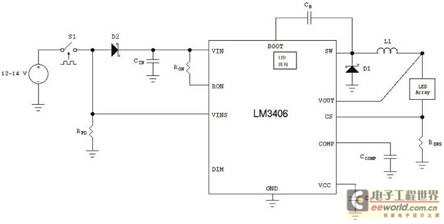 對(duì)于此應(yīng)用的調(diào)光和閃光部分,可以使用多種方法降低向LED陣列提供的功率。最常用的一種方法是脈寬調(diào)制(PWM)調(diào)光,這種方法通常使用專(zhuān)門(mén)的邏輯信號(hào)高速開(kāi)啟和關(guān)閉LED以控制總體光輸出。這種方法簡(jiǎn)單有效,但可能極少用于汽車(chē)電子系統(tǒng)應(yīng)用,因?yàn)樵诰€束中需要一根額外的線路用于調(diào)光信號(hào)。另一種方法稱(chēng)為雙線調(diào)光,向LED驅(qū)動(dòng)器提供的電源定期中斷以控制調(diào)光。1.5A整體式開(kāi)關(guān)穩(wěn)壓器LM3406具有此功能,其真實(shí)電流平均值實(shí)現(xiàn)更嚴(yán)密的光輸出控制。集成的N通道MOSFET不提供控制器集成電路具有的靈活性,因此降低了板上的復(fù)雜性。圖8顯示了使用雙線調(diào)光方法的LM3406應(yīng)用示例。