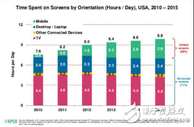 以電視而論,它還不止影響廣告,還牽涉內(nèi)容付費(fèi),要想感受這部分的權(quán)重可以看另外一張圖,下圖是2015年KPCB給出的美國人時(shí)間分配: