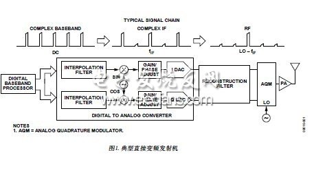 直接復(fù)調(diào)制逐漸成為在蜂窩基站、WiMAX、無線點(diǎn)對(duì)點(diǎn)等終端應(yīng)用中部署發(fā)射器信號(hào)鏈的首選架構(gòu)。這種技術(shù)直接將數(shù)模轉(zhuǎn)換器的輸出IQ信號(hào)調(diào)制到RF載波上(直接轉(zhuǎn)換),從而擺脫中間IF級(jí)和相關(guān)濾波器。圖1顯示典型的直接轉(zhuǎn)換發(fā)射器。